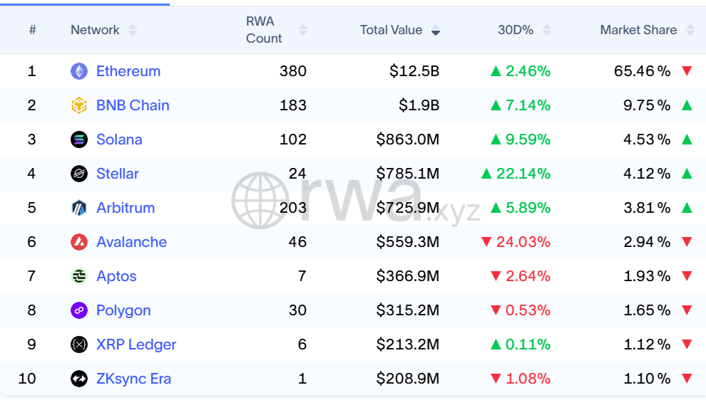 根據 RWA.xyz 最新統計,以太坊鏈上代幣化資產 TVL 達 125 億美元,市佔率 65.5%,遠超過 BNB Chain 的 20 億美元、 Solana 和 Arbitrum 的各不足 10 億美元。 BlackRock 、 JPMorgan 等華爾街巨頭已大規模上鏈代幣化國債、私人信貸和基金產品。 2025 年 RWA 市場成長超 212%,總規模突破 125 億美元,而機構調查顯示 76% 的資管公司計畫在 2026 年前投資代幣化資產。