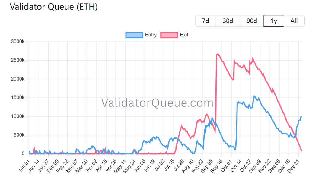具體來看,2025 年 9 月中旬 ETH 價格沖高至 4,700 美元附近時,累計 266 萬枚 ETH 選擇退出質押,形成了持續數月的賣壓。經過三個半月的消化,目前等待退出的 ETH 僅剩約 8 萬枚,這意味著賣壓來源基本消除。同時,等待進入質押的 ETH 卻激增至 90-100 萬枚,較 12 月底的 41 萬枚成長約 120% 。這個數字是退出隊列的 15 倍,導致驗證者啟動等待時間延長至 17 天。