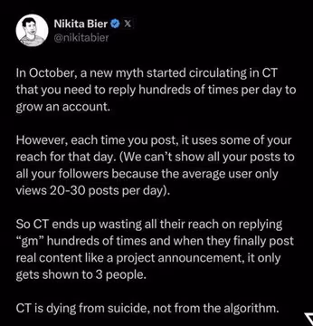 然而,這項利多消息的發布時機,恰好落在 X 與幣圈社群關係緊繃之際。就在前一天,Nikita Bier 曾發布一篇貼文(隨後刪除),內容被部分用戶解讀為「X 可能會限制高活躍用戶回覆貼文的頻率」。這在講求高互動、高傳播速度的幣圈社群引發軒然大波,用戶擔憂這將扼殺社群導向的討論空間,導致觸及率驟降。