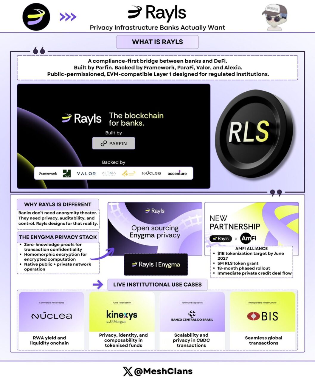 @RaylsLabs 將自己定位為連接銀行與去中心化金融(DeFi)的合規優先橋樑。由巴西金融科技公司 Parfin 開發,並獲得 FrameworkVentures 、 ParaFiCapital 、 ValorCapital 和 AlexiaVentures 的支持,其架構為專為受監管機構設計的公共許可型、兼容 EVM 的 L1 區塊鏈。