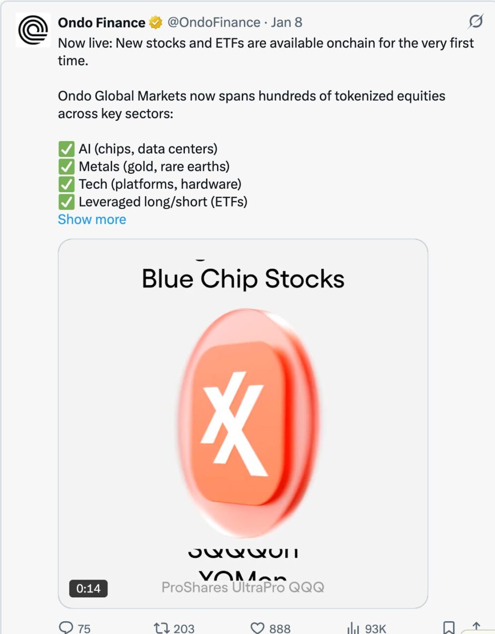 2026 年 1 月 8 日,Ondo 一次性推出了 98 種新代幣化資產,涵蓋人工智慧(AI)、電動車(EV)和主題投資等領域的股票和 ETF 。這不是小規模試水,而是快速推進。