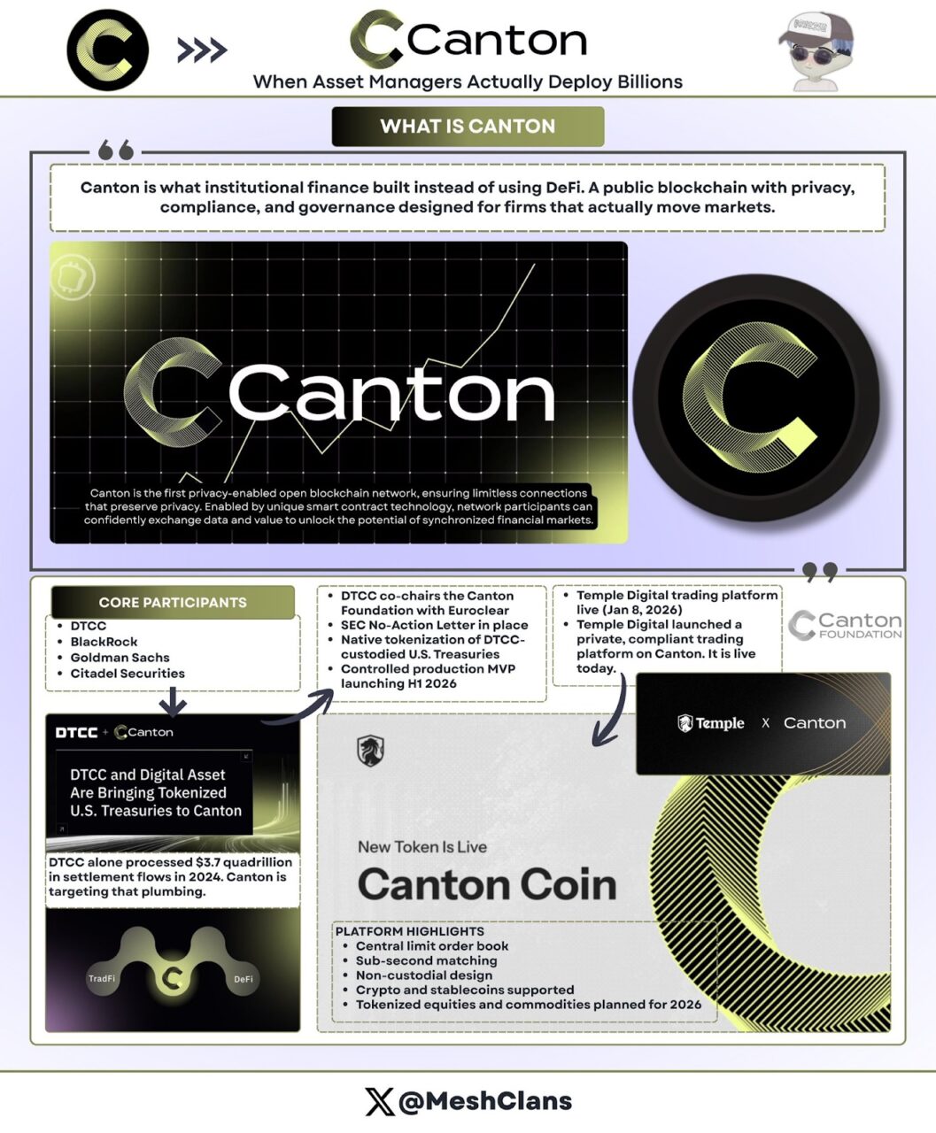 Temple Digital 平台上線(2026 年 1 月 8 日): Canton 的機構價值主張在 Temple Digital Group 於 2026 年 1 月 8 日推出的私人交易平台中得到了進一步明確。