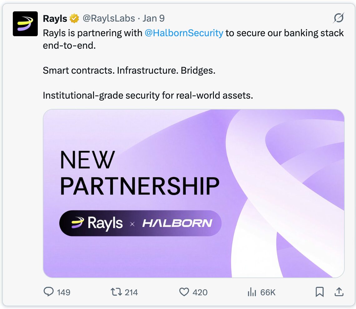 2026 年 1 月 8 日,Rayls 宣布完成 Halborn 進行的安全審計。這為其 RWA 基礎設施提供了機構級的安全認證,對於那些正在評估生產部署的銀行來說,這項認證尤其重要。