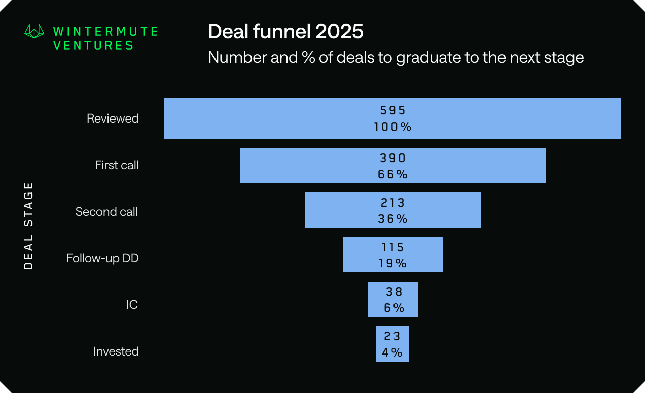 Wintermute Ventures 在 2025 年的一組數據揭示了殘酷的現實:這家頂級做市商和投資機構全年審查了約 600 個項目,最終只批准了 23 筆交易,批准率僅為 4% 。更誇張的是,連進入盡職調查階段的項目都只有 20% 。創辦人 Evgeny Gaevoy 毫不諱言地指出,他們已經徹底告別了 2021-2022 年的「噴灑祈禱」模式。