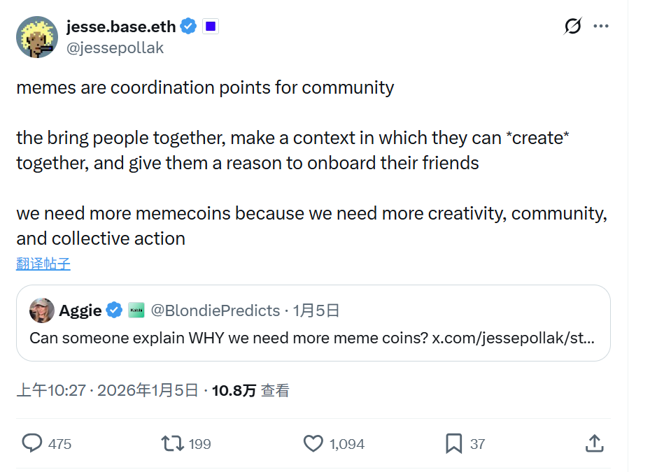 Base 鏈創辦人 Jesse Pollak 提供了一個有趣的視角。他多次強調 Meme 不僅是投機工具,更是「鏈上文化的核心」。透過圖片、影片、音樂等內容形式,Meme 能夠吸引數百萬新用戶上鍊,成為 Web3 大規模採用的入口。