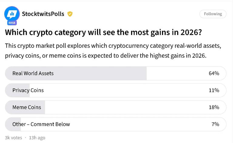 Stocktwits 最近的民調顯示:64% 的投資人認為 RWA 將在 2026 年帶來最強回報,遠遠超過 Meme 幣的 12% 和隱私幣的 8% 。但這個數字背後藏著一個問題──當散戶都開始喊著要配置 RWA 時,是真的認知升級了,還是只是 2025 年 Meme 崩盤後的 PTSD 反應?
