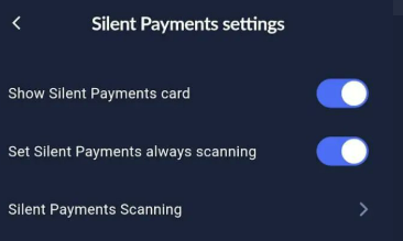 如果您希望錢包繼續自動檢查靜默支付的新區塊,請前往「選單」->「靜默支付設定」,並啟用「始終掃描靜默支付」選項。