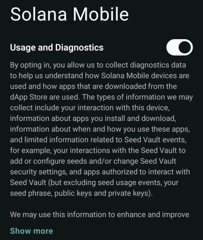 啟用診斷功能(Enable Diagnostics): 進入設定(Settings)-> Solana Mobile -> 開啟使用與診斷(Usage & Diagnostics)。注意: 這允許系統衡量你的參與。請避免使用自動化工具(如自動點擊器),因為這些資料對系統是可見的。