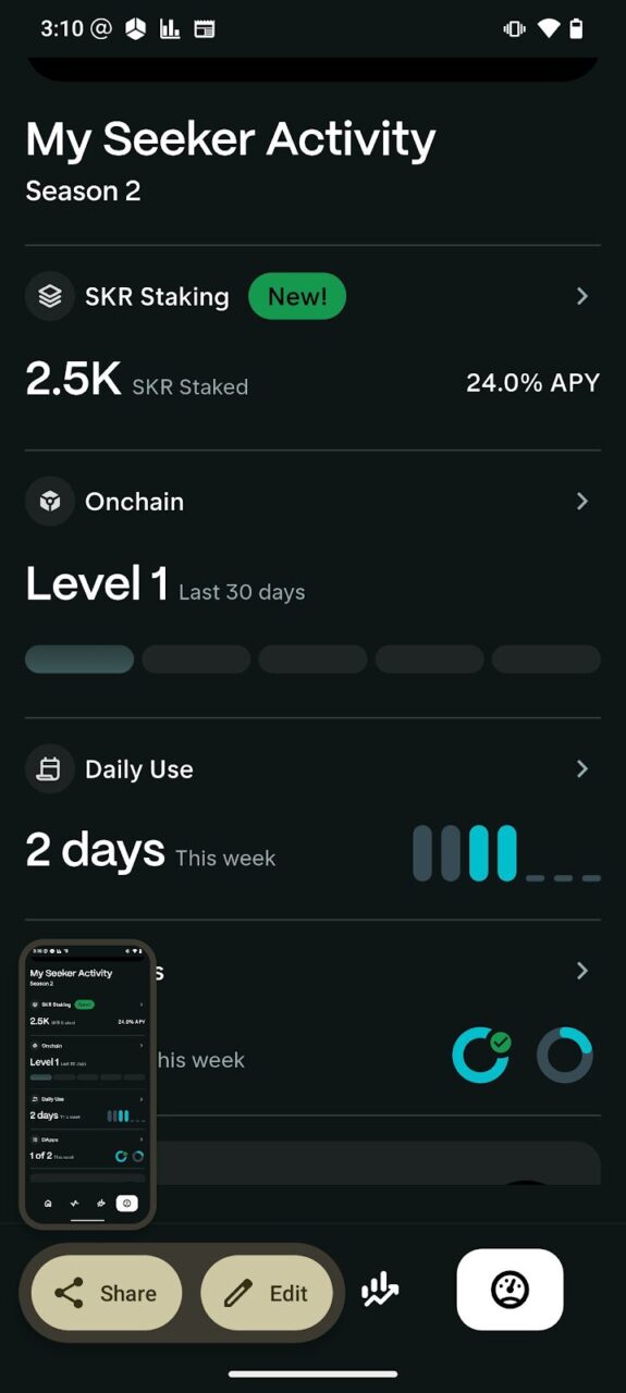 賽季活動是一個追蹤系統,位於你原生的 Seeker 錢包(Native Seeker Wallet)最右側的選項卡中,標題為「我的 Seeker 活動」(My Seeker Activity)。它透過追蹤你在多個類別的參與度,來確定你在生態系統中的「排名」(Rank),這被廣泛預期將影響未來的空投(如 $SKR)。