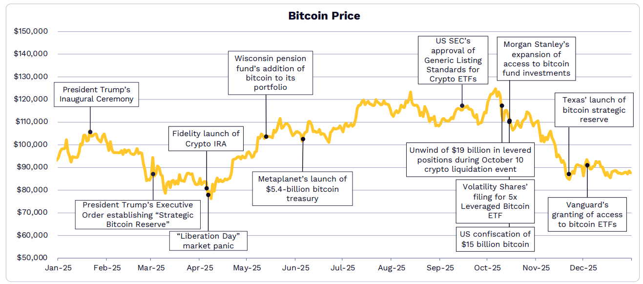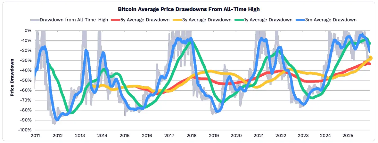 2025年,比特幣價格相對於其歷史最高點的平均跌幅有所平緩。