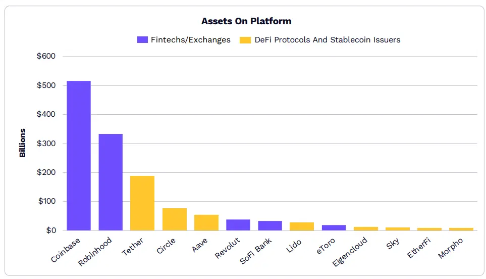 傳統金融科技平台和加密原生平台之間的資產規模差距正在縮小,這表明傳統和鏈上基礎設施正在融合。