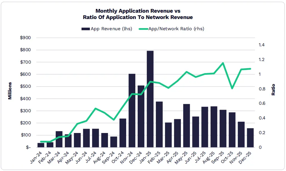 在 Hyperliquid 、 Pump.fun 和 Pancakeswap 的引領下,2025 年應用總收入達到了約 38 億美元的歷史新高。