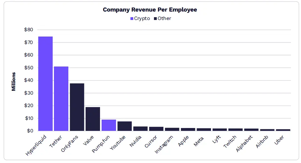 全球最具營收效率的公司包括Hyperliquid 、Tether和Pump.fun 。