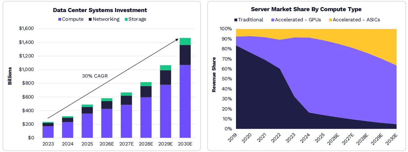 隨著 AI 工作負載在企業和消費者環境中擴散,到 2030 年,AI 基礎設施投資可能超過 1.4 兆美元,其中大部分將用於加速伺服器。 ARK 研究表明,Broadcom 和亞馬遜旗下 Annapurna Labs 等公司設計的 ASIC 將繼續佔據市場份額,因為 AI 實驗室和超大規模企業都在尋求經濟高效的運算能力。