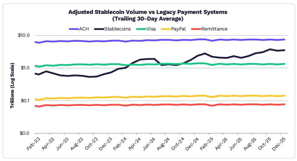2025 年 12 月,穩定幣交易量 30 天移動平均為 3.5 兆美元,是 Visa 、 PayPal 和匯款(Remittances)總值的 2.3 倍。