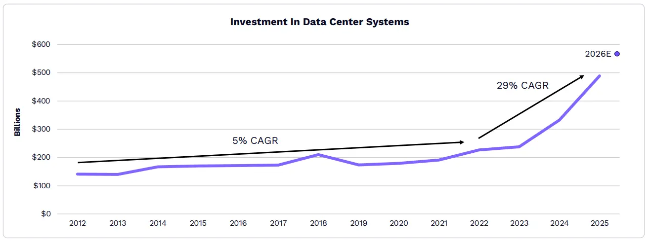 到 2025 年,資料中心系統的年度投資額約為 5,000 億美元,幾乎是 2012 年至 2023 年平均值的 2.5 倍。根據 ARK 研究,此類投資將持續成長,到 2030 年可能成長兩倍,達到約 1.4 兆美元。