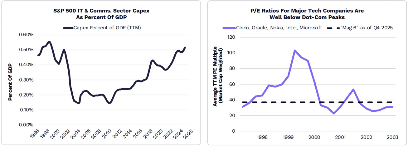 根據 ARK 研究,超大規模資料中心營運商在 2026 年的資本支出將超 5,000 億美元,幾乎是 2021 年 1,350 億美元的三倍(即 2022 年 ChatGPT 熱潮之前)。儘管資訊科技和通訊服務業的資本支出佔 GDP 的比例已達到 1998 年以來的最高水平,但科技業的本益比(P/E)卻遠低於科技與電信泡沫時期的峰值。