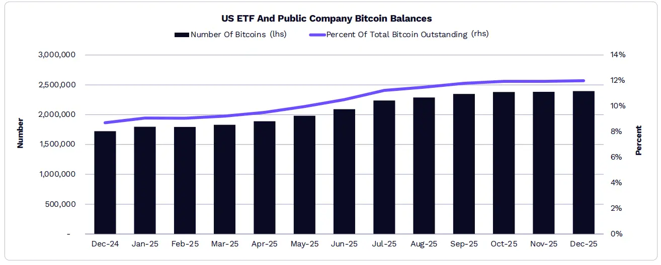 2025 年,比特幣 ETF 的持股成長 19.7%,從約 112 萬枚增至約 129 萬枚;而上市公司持有的比特幣數量增加了 73%,從約 59.8 萬枚增至約 109 萬枚。因此,由 ETF 和上市公司持有的比特幣總量佔比從 8.7% 上升至 12% 。