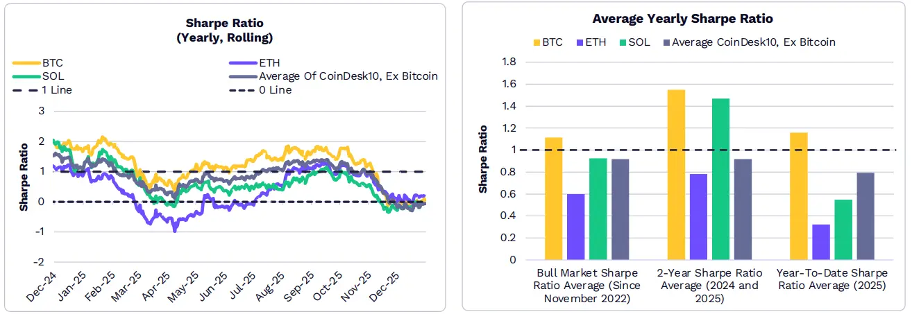 在 2025 年的大部分時間裡,比特幣的風險調整後收益超過了大多數其他市值較大的加密貨幣和指數。自從最近一輪週期低點(2022 年 11 月)、 2024 年初以及 2025 年初以來,比特幣的平均年化夏普比率也超過了以太坊、 SOL 以及 CoinDesk 10 指數中其他九種成分幣的平均值。