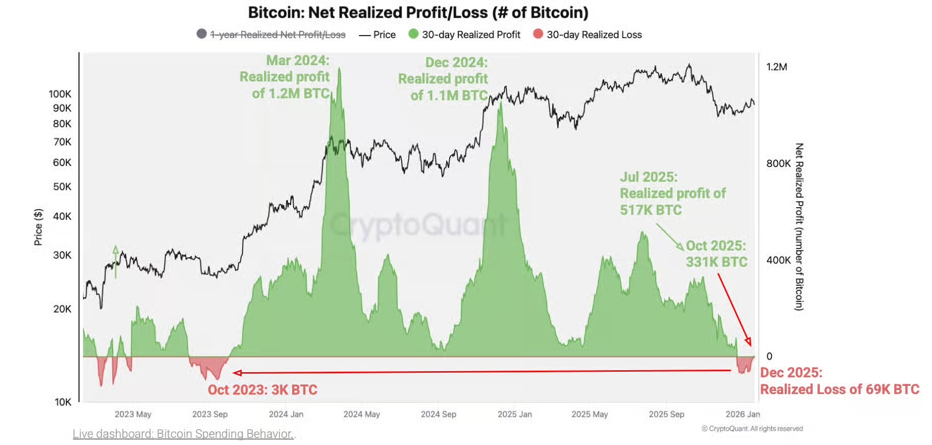 數據顯示,自 2025 年 12 月 23 日以來,比特幣持有者已實現的累計虧損,換算約相當於 69,000 枚比特幣。 CryptoQuant 認為,這種獲利動能的長期疲軟,正是「牛市終結」的典型徵兆。
