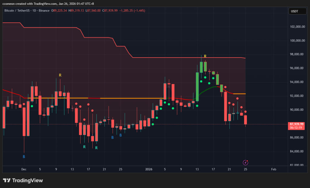 上週 BTC 再次跌破 9 萬美元,在週末甚至跌破關鍵的 8.8 萬美元,之前就有討論過如果 BTC 有效跌破 8.8 萬,很可能下試 8.2 萬美元。目前日線圖表可以看到,BTC 已經在一週內第三次測試 8.8 萬這個支撐位置,如果在這個禮拜沒能成功站回 9 萬,很大機會就這樣繼續跌下去。