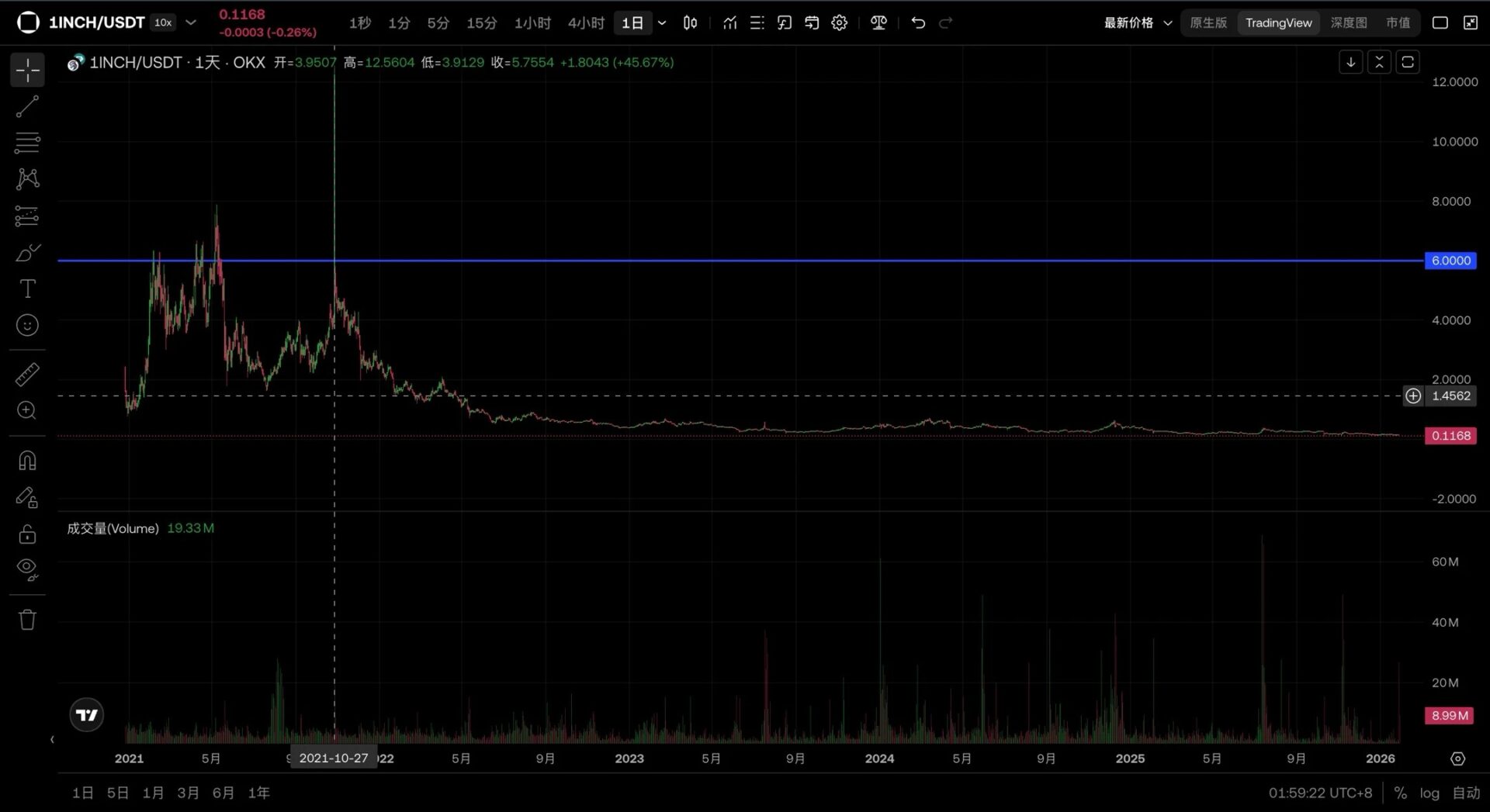 然而,即便最終被證明是一場誤讀,這次賣出對 1INCH 本就持續走弱的價格而言,依然構成了現實層面的二次衝擊。自上一輪週期高點 6 美元起,1INCH 經歷了長期的單邊下行,如今徘徊在 0.11 美元附近。