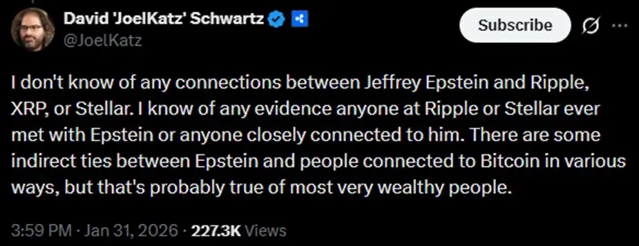 那麼這能說明艾普斯坦的邪惡也存在於加密貨幣領域嗎? David Schwartz 也表示,對於大多數超級富豪來說,與比特幣間存在關聯可能都是非常常見的。