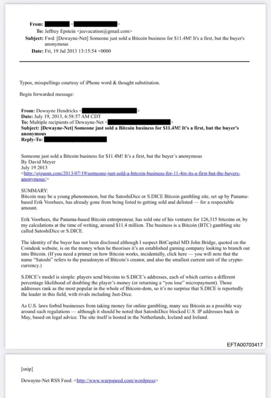 而另一封郵件則顯示,艾普斯坦參與了比特幣基礎設施公司 Blockstream 的種子輪融資,該輪融資總額為 1,800 萬美元,艾普斯坦的投資從 5 萬美元最終增至 50 萬美元。