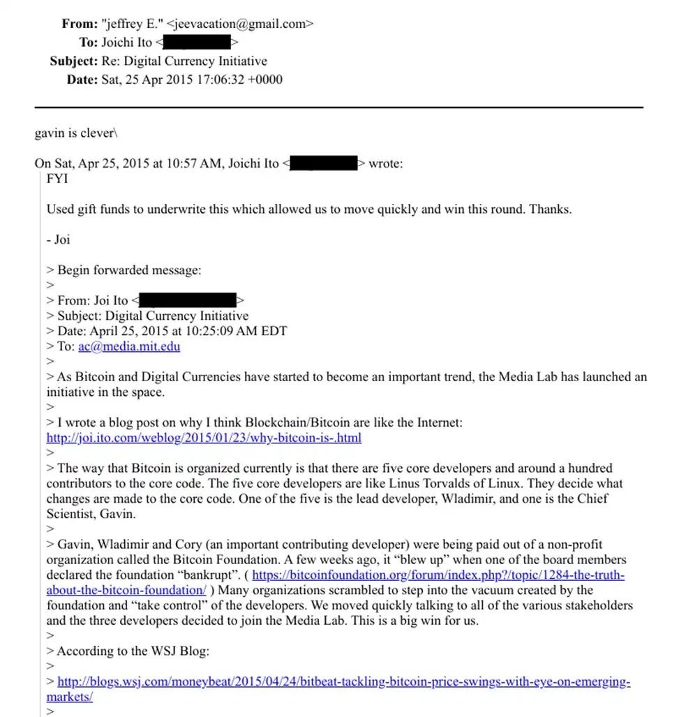 當時,醜聞還未曝光,大眾也不知情艾普斯坦向麻省理工學院媒體實驗室的匿名捐贈。伊藤簍一透過電子郵件向艾普斯坦表示感謝,不僅向艾普斯坦解釋了 Bitcoin 的開發運作情況,還表示多虧有這筆錢讓實驗室「能夠快速行動並取得巨大勝利」,因為「很多組織都想趁虛而入控制比特幣的開發者」。