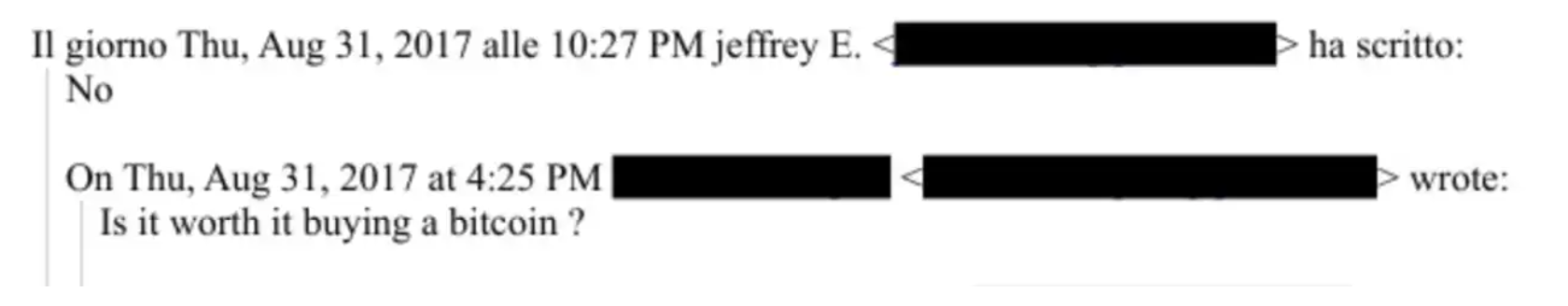 如果艾普斯坦真的見過中本聰,那麼似乎中本聰並沒有在和艾普斯坦的接觸中成功地向他佈道比特幣。在 2017 年 8 月 31 日的往來郵件中,艾普斯坦回覆「是否值得買一個比特幣」的問題時,他乾脆地回覆了「No」。而當時,一個比特幣還不到 5,000 美元。