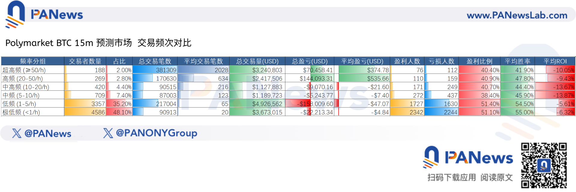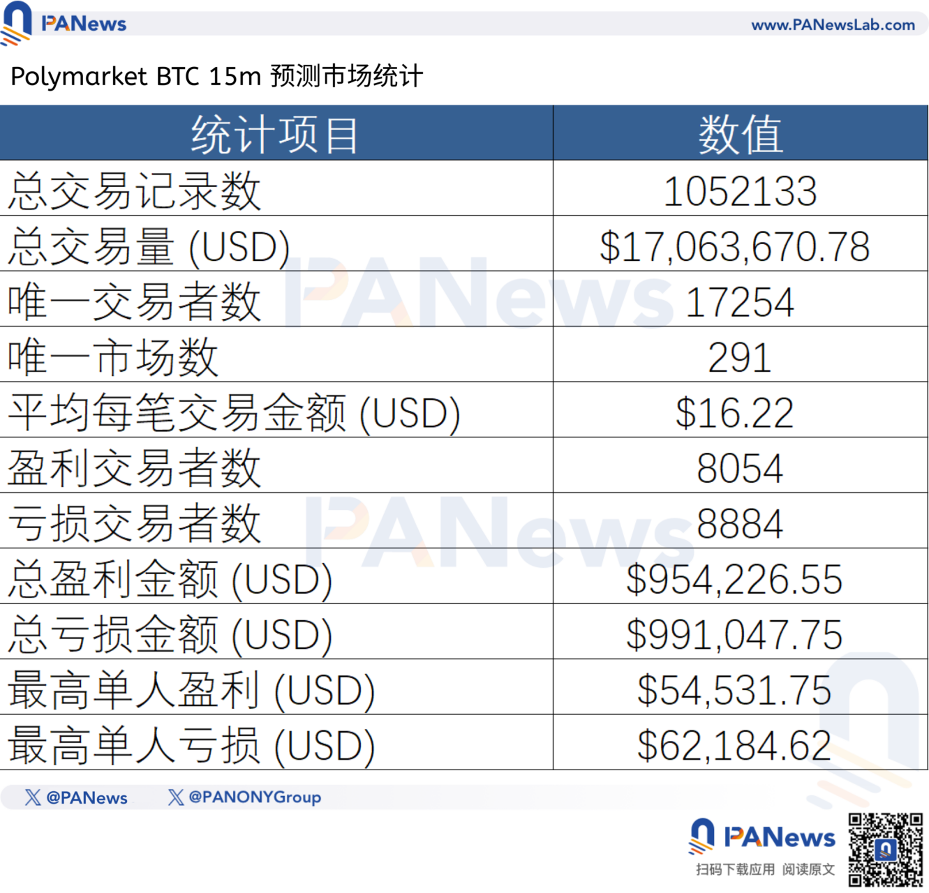 近日,PANews 分析團隊對比特幣 15 分鐘漲跌預測市場進行了全量資料復盤。在涵蓋約 3 天、 291 個短期市場、總計 105 萬筆交易的龐大資料庫中,我們看到的不只冰冷的數字,而是一場演算法與人性赤裸裸的博弈。
