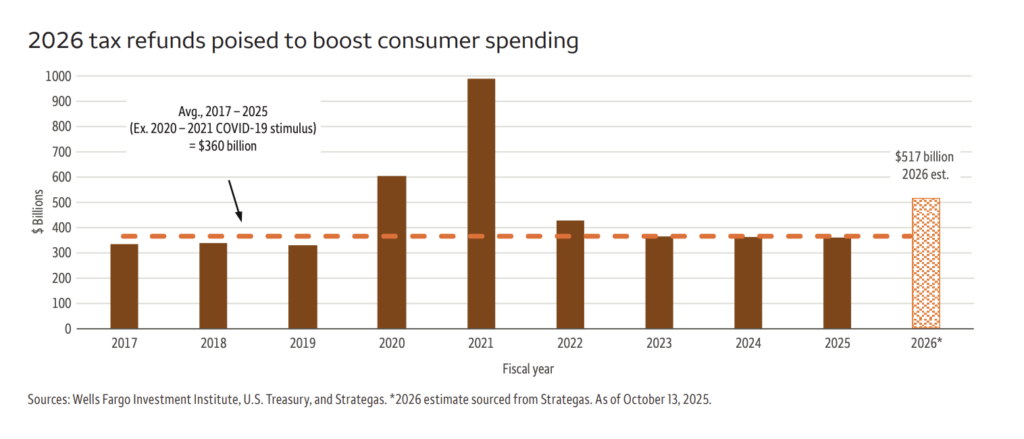 富國銀行投資策略分析師表示,這波接近 30% 的年增率退稅將「實質提振消費,協助美國經濟於 2026 年重拾動能」。