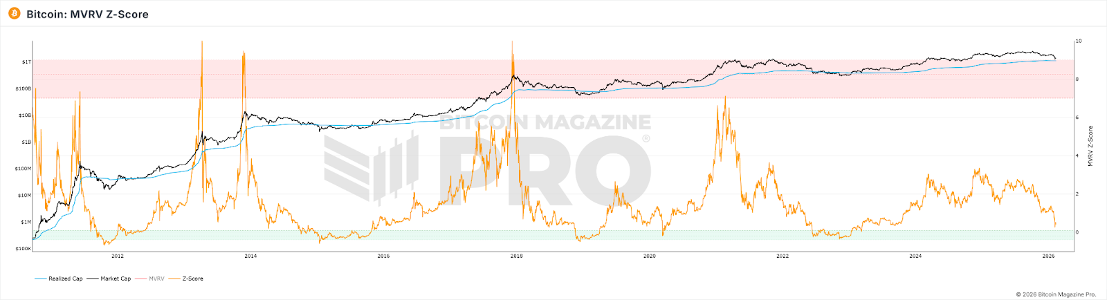 MVRV Z-Score 是一個鏈上估值指標,透過比較比特幣的市場價值(當前市值)與實現價值(每枚比特幣以最後一次鏈上移動時的價格計算的總值)的偏離程度來判斷市場估值。傳統上,Z-Score 超過 7 被視為市場過熱的賣出訊號,低於 0 則被視為極度低估的買進訊號。