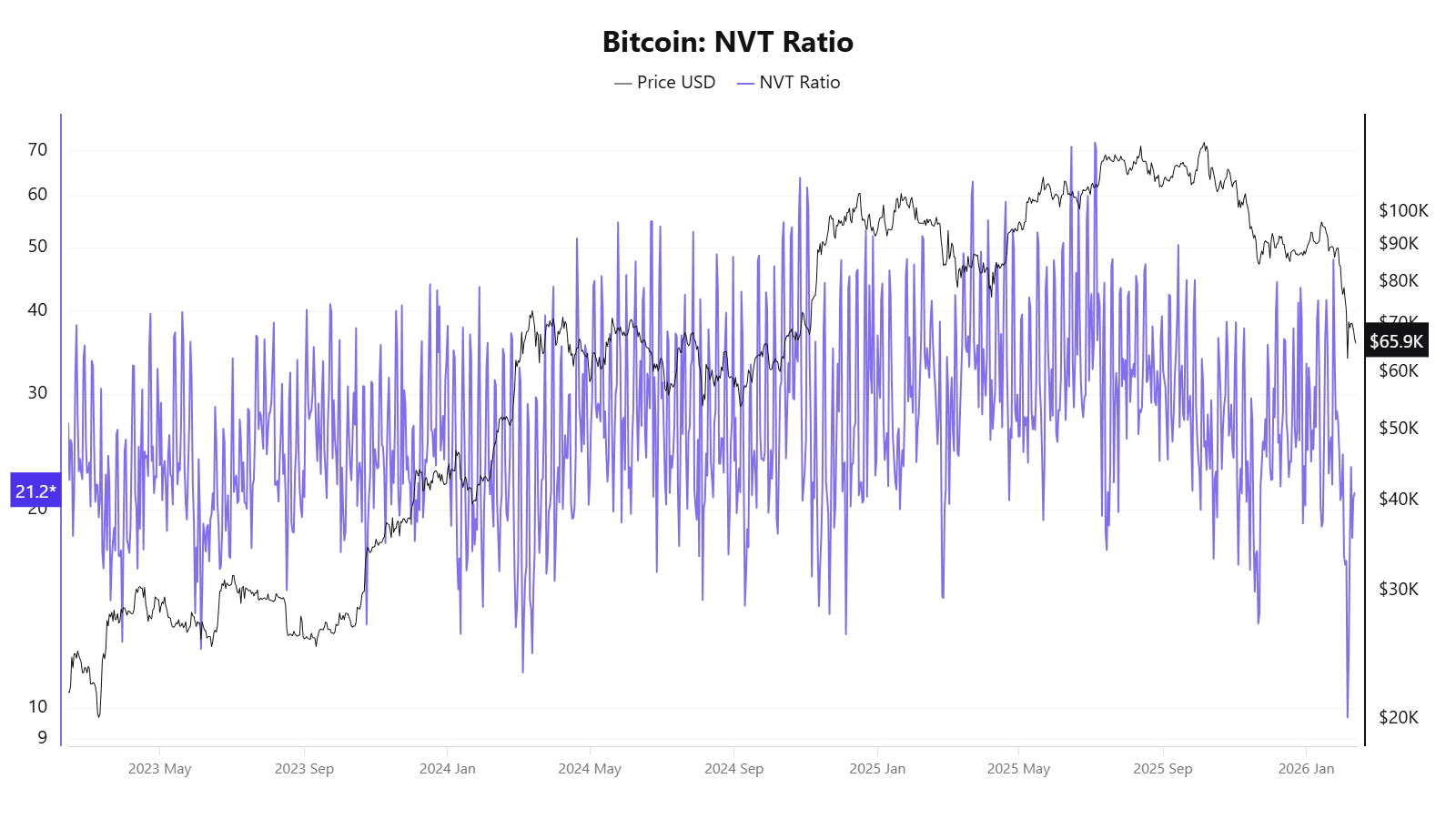 NVT 比率稱為「加密版本益比」,用網路市值除以日鏈上交易金額,高 NVT 可能意味著高估,低 NVT 則可能低估。