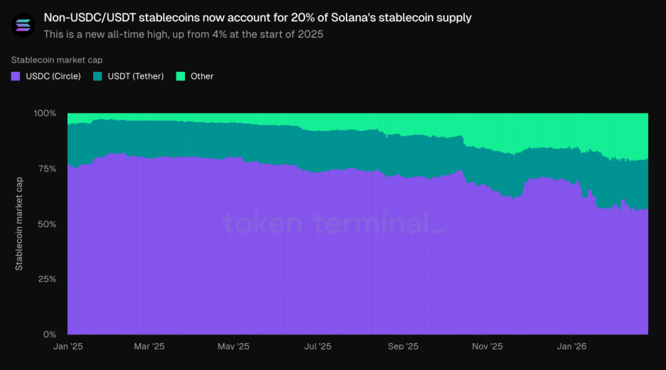 值得注意的是,非 USDC/USDT 的穩定幣供應量在過去 12 個月內成長了約 15 倍,占到總供應量的 20% 以上。這種「雙超多強」的格局降低了 Solana 對單一發行方的依賴,進而提升了整個生態的韌性。