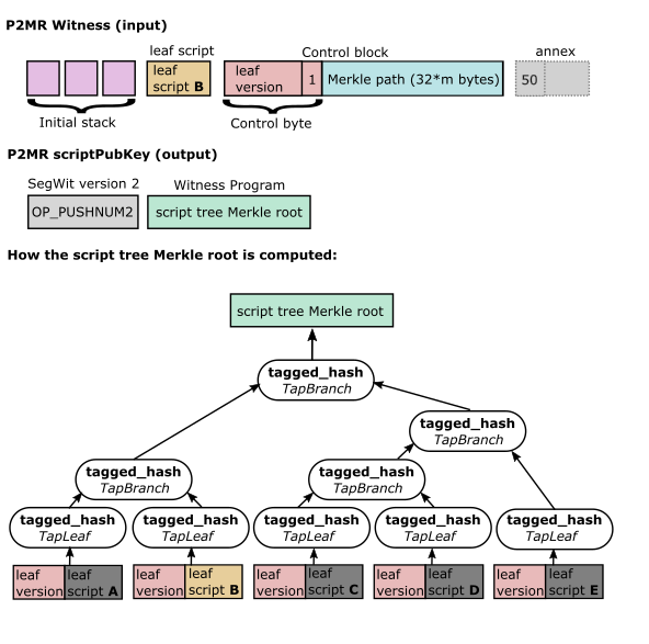 BIP 360 提出的解方是引入新輸出類型「支付給默克爾根」(Pay-to-Merkle-Root,P2MR)。 P2MR 是一種哈希樹結構,直接承諾到腳本樹的默克爾根,不再依賴內部金鑰或微調操作,等於在保留 Taproot 腳本功能的同時,切斷了產生量子脆弱性的路徑。