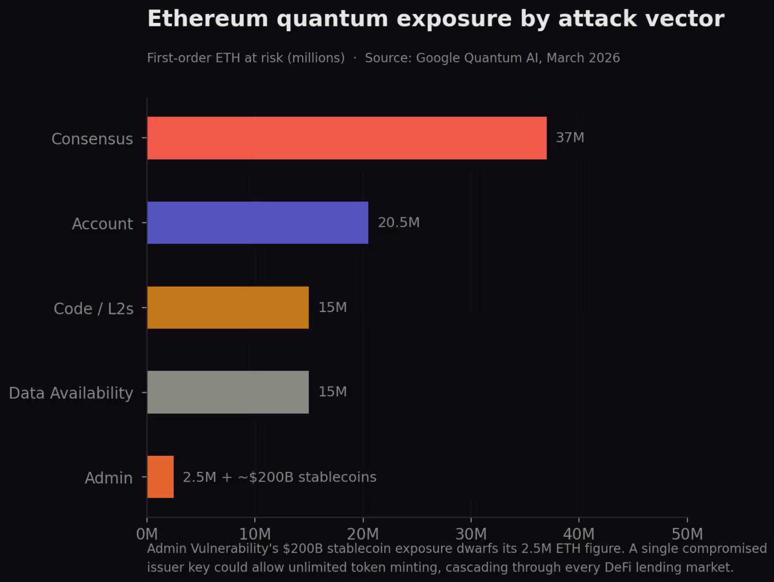 Google 量子 AI 團隊周一發布最新報告,加密貨幣社群的目光幾乎都聚焦在比特幣身上:9 分鐘就能破解、高達 41% 的失竊機率,以及暴露在風險中的 690 萬枚比特幣,而報告中關於「以太幣」的篇幅卻遭到市場冷落,殊不知當中潛藏的風險更為驚人,值得全體投資人投以最高級別的警戒。