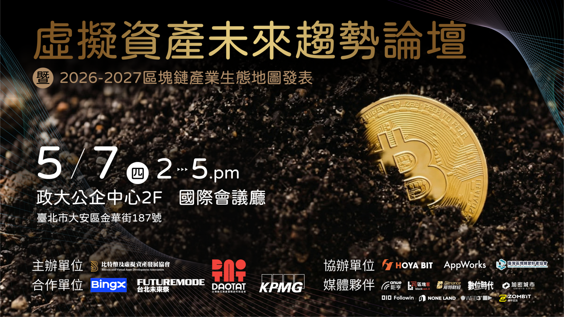 隨著全球虛擬資產市場邁入關鍵轉型期,台灣如何在全球數位金融浪潮中精確定位?由「比特幣及虛擬資產發展協會」與聯手主辦的年度盛事——「2026-2027 虛擬資產未來趨勢論壇暨台灣區塊鏈產業生態地圖發表會」,將於 2026 年 5 月 7 日於政大公企中心國際會議廳隆重舉行。本次活動將匯集超過百位產業領袖、監管單位代表及投資機構,共同見證台灣區塊鏈產業的全新發展指標。